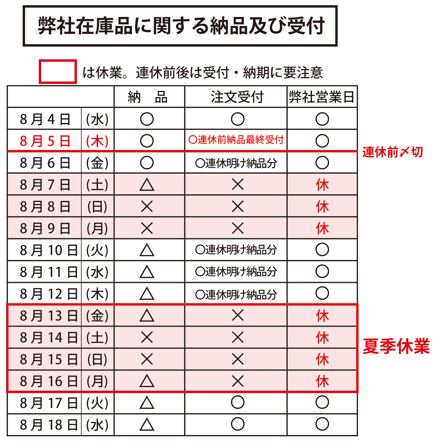※8月17日(火)以降、連休明け納品につきましても、納品場所によっては通常時期より配送日数がかかる可能性がございますのでご注意ください。