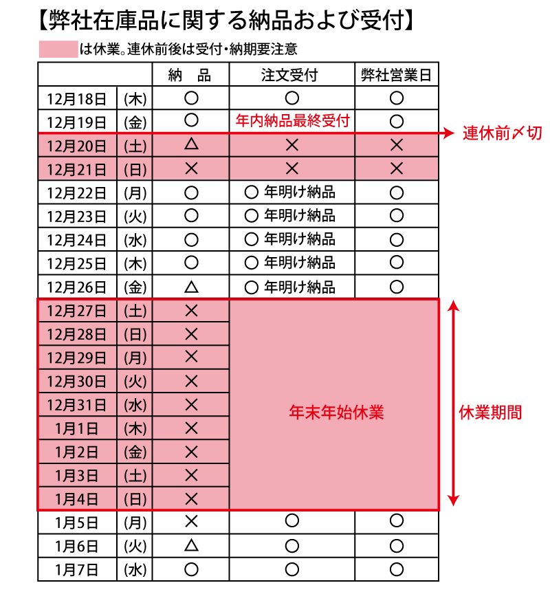 また、来年1月30日(金)は棚卸の為、出荷業務ができませんので、あわせてご案内申し上げます。