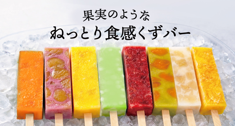 涼し葛玉の素にプラスでシャーベットパウダーを加えることで、果実のようなねっとり食感を楽しめる葛バーが出来上がります。